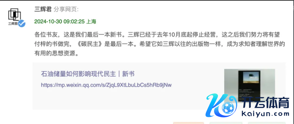 10月30日,国内知名典籍出书公司三辉典籍在官方账号推送了新书《碳民主》的信息,并向读者晓谕三辉典籍罢手运营:“诸君书友,这是咱们临了一册新书。三辉也曾于昨年10月底起罢手瞎想,这之后咱们勤奋将有望排印的书作念完,《碳民主》是临了一册。但愿它如三辉以往的出书物同样,成为肄业者相识全国的有效的念念想资源。”