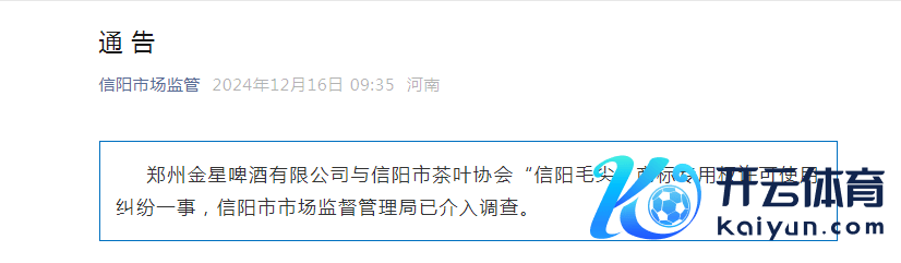 12月2日,信阳市茶叶协会发布《对于爱戴信阳毛尖正当权益的公告》称,商场及收罗平台上销售显耀记号为“信阳毛尖”及第精酿啤酒等多类居品,严重骚动“信阳毛尖”商标权。条款在2024年12月31日前,悉数“信阳毛尖”茶啤酒出产及销售企业应完成整改,不得将“信阳毛尖”字样算作居品称号等进行商标性使用。