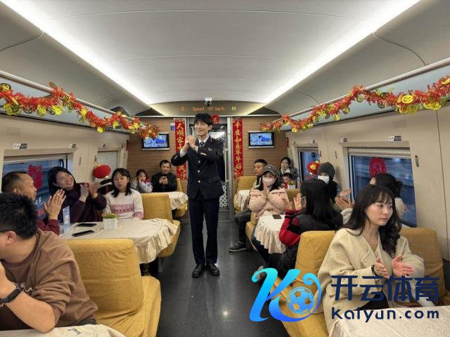 "祈福你在你的一世里,恒久充满满足……"伴跟着欢快的音乐响起,列车逐步驱动。走进车厢,火红的灯笼和新春福字将列车袒护一新,处处飘溢着喜庆吵杂的氛围。
