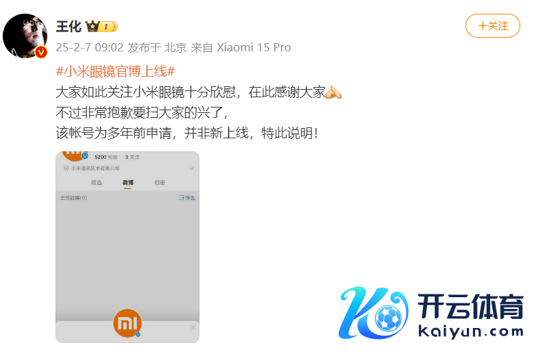 2月7日上昼,小米集团公关部总司理王化微博发文默示,“公共如斯关注小米眼镜十分雀跃,在此感谢公共,不外相配对不起要扫公共的兴了,该帐号为多年前恳求,并非新上线,特此表露!”